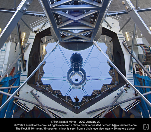 The twin Keck 10-meter mirrors are foremost among the world’s optical telescopes. Each is comprised of 36 hexagonal mirror segments placed edge-to-edge to form a continuous light-collecting surface of 76 square meters.