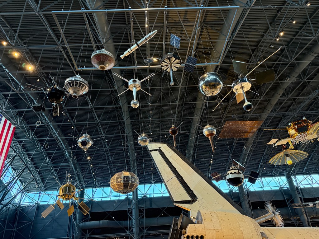 This wide shot looks up into a ceiling filled with spacecraft of different eras and purposes—exactly the kind of display that makes you feel like you’re standing inside a time-lapse of the Space Age.