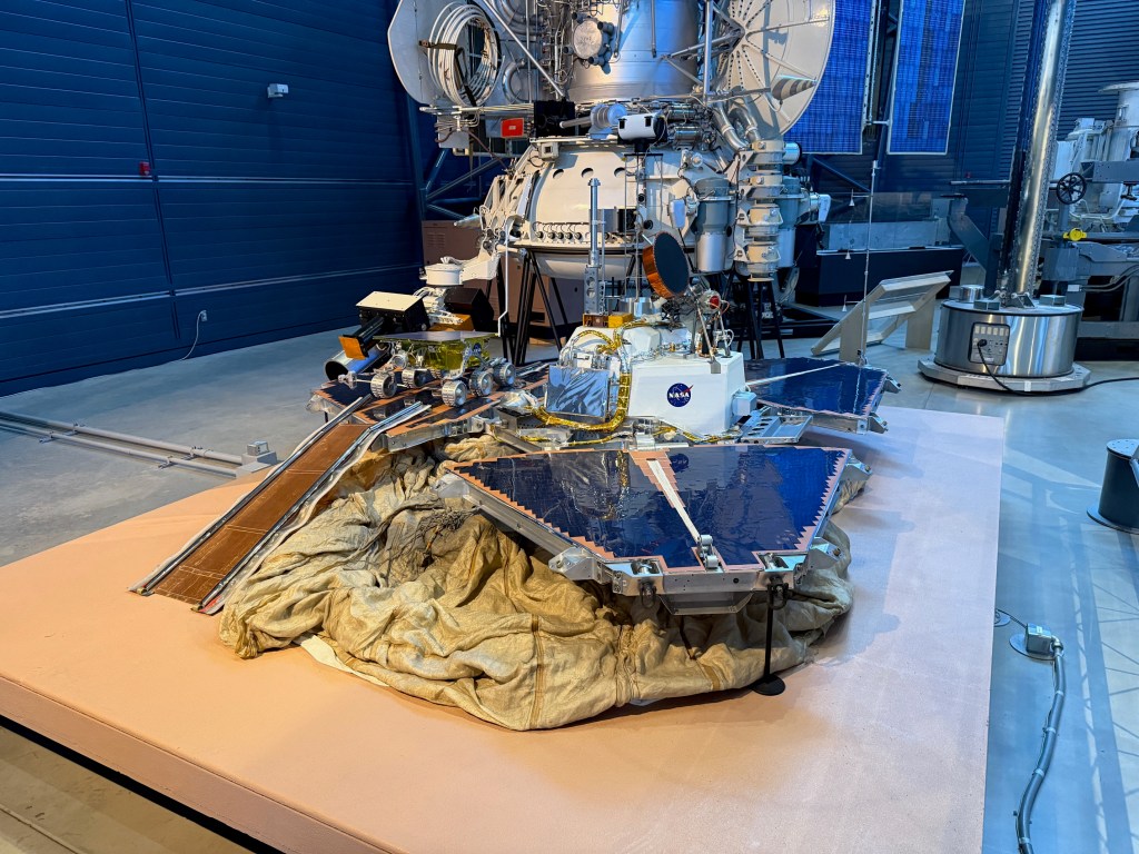 A Mars lander + rover display with airbags and solar panels