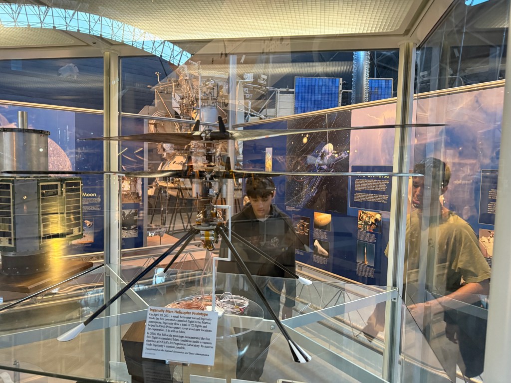Inside the glass case is the Ingenuity Mars Helicopter prototype, one of the most inspiring “small hardware, huge meaning” artifacts of modern exploration.