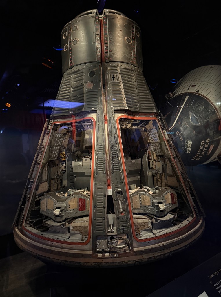 In the space galleries, the hardware has a particular honesty. A two-seat capsule (Gemini) sits there like a compact survival cell: dense panels, a narrow opening, and seats that look more like they belong in a test rig than a spacecraft.
