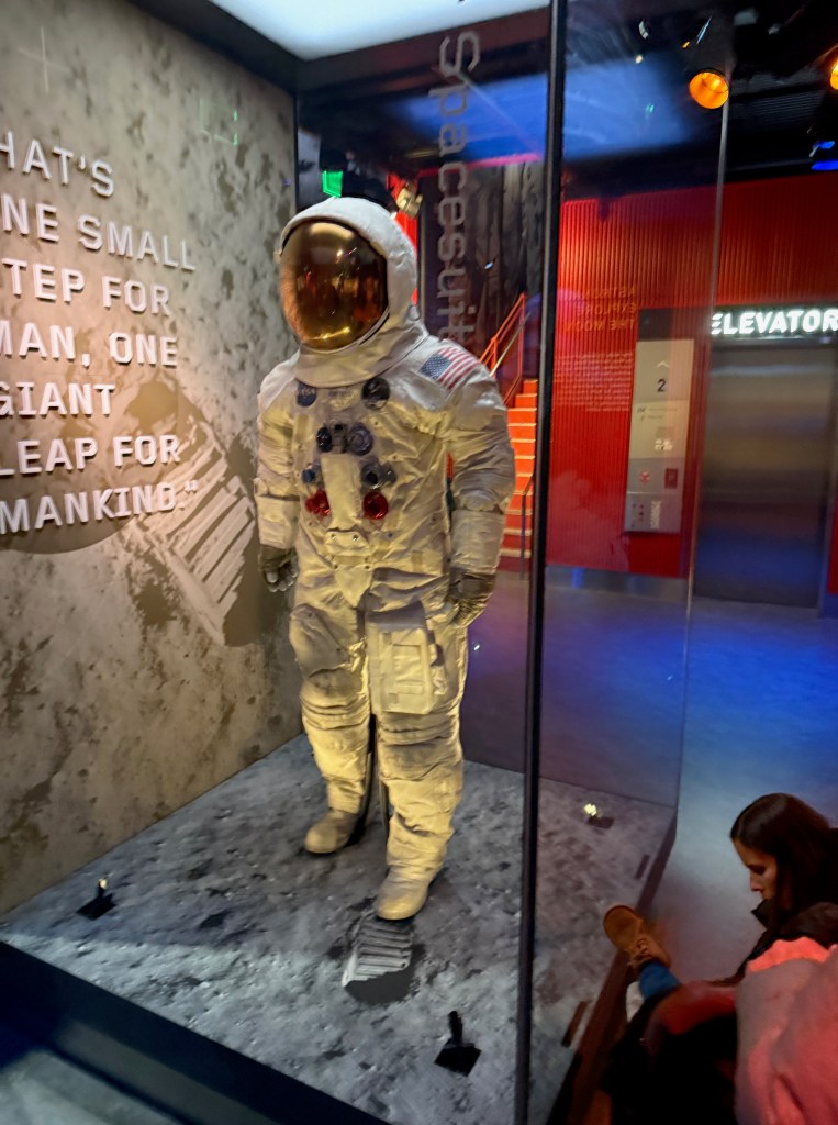 A spacesuit behind glass can look like a symbol of human achievement. Up close, it reads like equipment: layers, fittings, connectors, and the unmistakable bulk of something designed to keep a human alive where humans aren’t supposed to be. To think that Buzz landed with this on the moon blows my mind.