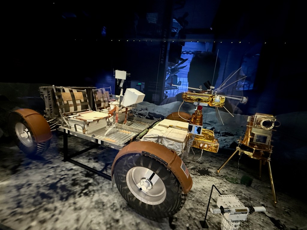 Another exhibit that stuck with me was the Moon buggy. Platform and instruments look almost improvised compared to modern spacecraft. Big wheels. Simple frames. Gold insulation catching the light. Tools and boxes arranged with the logic of fieldwork, not showroom design.