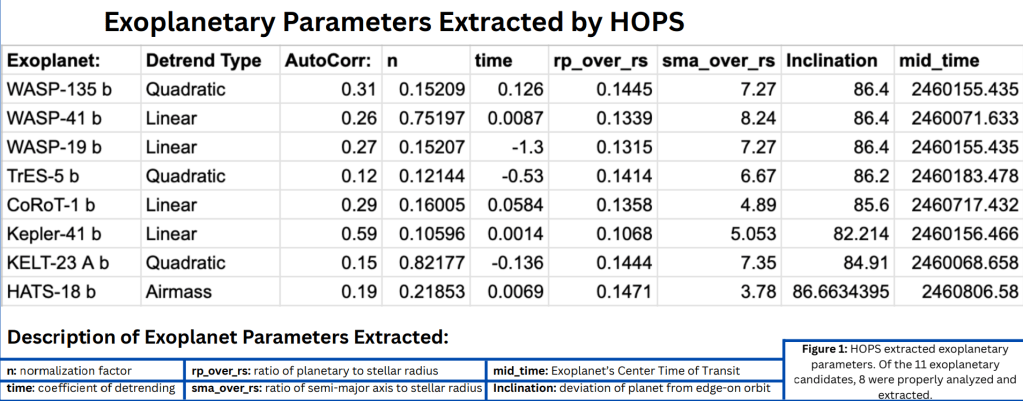 The consistency of parameter values between the HOPS software and the research developed by other scientists speaks to the efficacy of HOPS. It is Photometry Software that enables scientists and people at all career levels to perform significant research in the field of astronomy with less coding experience needed compared to a formal research process. In addition, HOPS executes the MCMC fitting algorithm at a quicker rate than standard MCMC algorithms coded by other scientists. This is extremely helpful in cutting down the amount of time spent running these simulations.