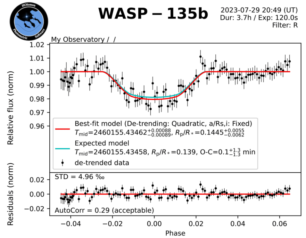 With the values derived by HOPS, one can clearly see that the fitting created by HOPS is consistent with the datapoints derived by the aperture photometry. In addition, the fitted parameters (Rp/Rs and n) are mostly consistent with previous observations within research papers (Spake et al. 2016 for WASP-135, Mislis et al.